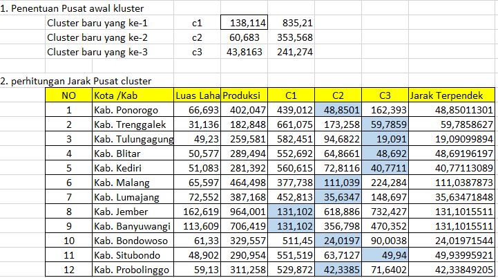 2. Perhitungan jarak pusat cluster dengan menggunakan rumus Euclidian distance